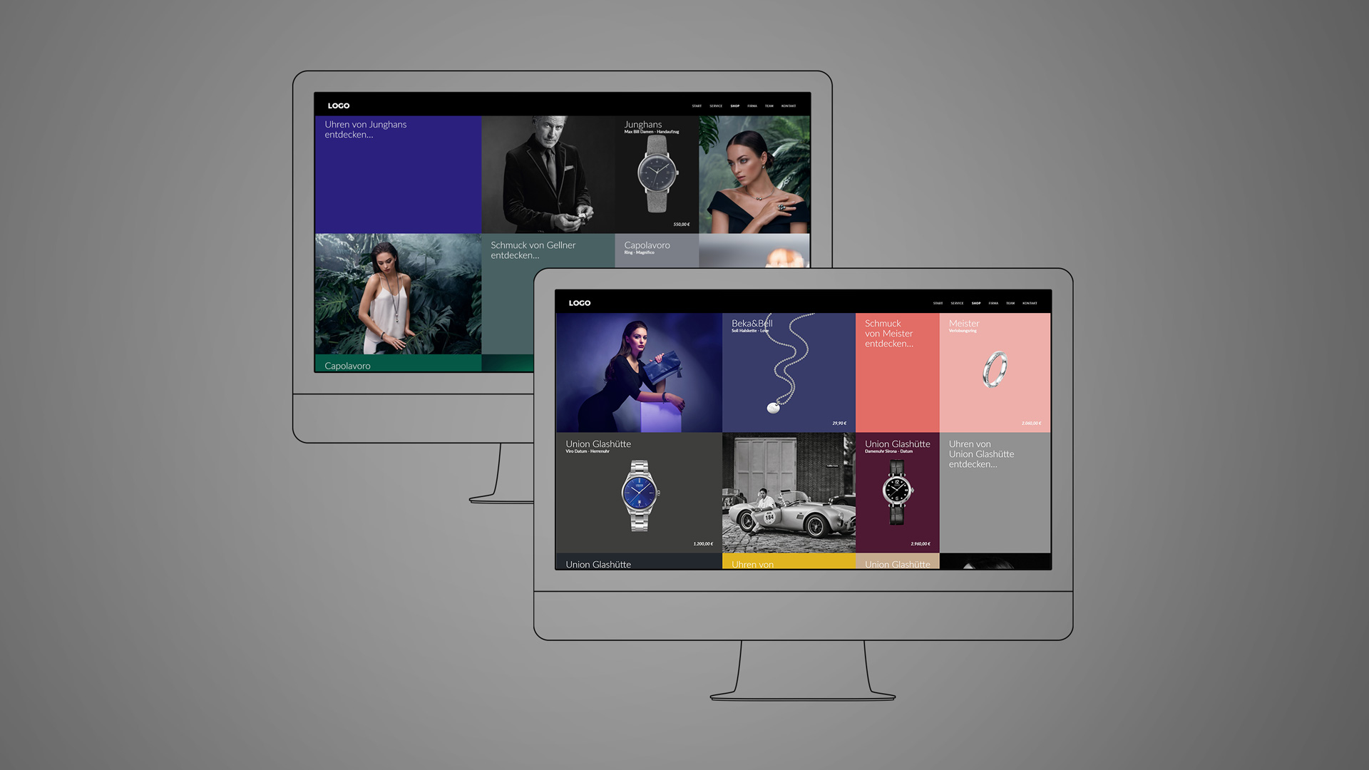 Erarbeitung eines Onlineshop-Layouts, zugeschnitten für Kunden aus der Uhren- und Schmuckbranche. Dargestellt ist eine moderne Variante mit Kacheln variierender Größe. Der Anspruch bestand im Aufbruch gewohnter Weblayoutstrukturen und dem emotionalen Highlighting der Produkte.